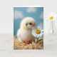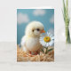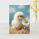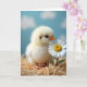 Designed with a close-up nature scene, the card features a fluffy pale-yellow baby bird nestled into golden straw, leaning toward a white daisy as if sharing a quiet hello ❤️. Soft, diffused light makes the downy feathers glow gently, while a tiny orange beak and small feet add warm little accents. The bird’s dark, curious eye is turned toward the flower, giving the moment a tender, friendly feel, like two new companions meeting for the first time 🌼. Behind them, a calm sky-blue background fades into blurry, cloud-like shapes that keep the focus on the pair. The daisy’s crisp white petals circle a sunny yellow center, standing out against the straw’s fine texture. A short greeting sits near the top in a light, warm tone, with a smaller line placed near the bottom in soft gray. The shallow focus keeps the foreground sharp while the background stays dreamy and quiet. Individual straw strands and the daisy’s petal edges appear finely detailed against the smooth blue backdrop.