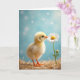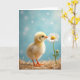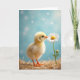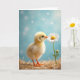 Designed with a soft, dreamy look, this card features a fluffy yellow baby bird standing on the left in a nest of golden straw, its tiny orange beak and matching feet catching the light. The bird leans slightly toward a white daisy on the right, as if sharing a shy, affectionate moment like close friends discovering something together ❤️. The daisy’s white petals circle a sunny yellow center, and a small green bud sits lower on the stem, adding a gentle sense of growing closeness. A pale sky-blue background fades into a blur with faint, round light spots that feel like distant sparkles, keeping attention on the pair. Any greeting text can sit centered near the top in a soft gray or warm gold, with a smaller line near the bottom in muted green to echo the stem 🌼. The lighting stays diffused and tender, bringing out the downy texture of the chick and the crisp edges of the petals. The composition keeps the chick on the left and the tall daisy on the right against the blue blur, with straw strands framing the lower edge.