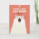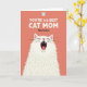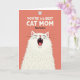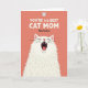 This greeting card features a fluffy white cat against a coral background, filling most of the lower area with its head tipped back as if calling out for attention. The cat’s pink tongue, tiny visible teeth, and fine whiskers add a teasing, needy charm, like an affectionate nudge between close companions ❤️. Near the top, large white uppercase text reads “YOU’RE THE BEST CAT MOM,” centered and easy to spot. Just below that, a smaller slanted line of black text says “Now feed me,” landing like a cheeky aside from a pet that knows it’s adored. A small alarm clock icon sits above the wording, hinting at a timely routine and a familiar kitchen moment. The limited palette of coral, white, and soft pink keeps the focus on the cat’s fluffy texture, drawn with many short curved strokes that suggest thick fur. The cat’s open mouth and lifted chin create a cozy, humorous sense of closeness, like a daily ritual shared with a favorite caregiver 🌼. At the very top, the tiny clock graphic is simple and dark, with small bells and short hands.