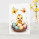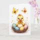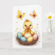 This card features a fluffy yellow baby bird with downy golden feathers and a neatly tied yellow bow, tucked snugly into a nest of brown twigs as if being gently cared for. Its big, glossy eyes with long dark lashes and its wide smiling beak give it a sweet, friendly look, like it’s greeting someone close. Around the nest sit four decorated eggs in soft teal, pale blue, sunny yellow, and light pink, each dotted with tiny white flower shapes that feel like a quiet springtime gift. Above them, two small butterflies drift in warm yellow and soft orange, adding a light, airy touch 🌷. Near the top of the card, a short greeting line appears in a soft golden color, centered and easy to spot against the white background. The white backdrop is lightly sprinkled with small golden star shapes, giving the scene a gentle sparkle without crowding it. Fine texture details show the bird’s fuzzy fluff, the rough twigs, and the smooth egg shells, with the little golden stars scattered mostly around the upper half.