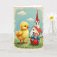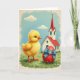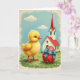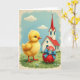 Designed with a fluffy yellow chick in the foreground, this illustration shows it standing on orange webbed feet and looking with gentle curiosity at an oversized red egg, as if sharing a quiet springtime moment 🐰. A wide blue ribbon wraps the egg and gathers into a neat bow, with small light-blue and yellow flowers tucked around it like a thoughtful gift. The chick’s bright eyes and slight tilt toward the egg add a tender, friendly connection to the scene, like it’s admiring something made for someone special. The ground is a grassy green field with fine texture, sprinkled with tiny blue wildflowers that lead your eye across the picture 🌷. In the distance sits a small white building with a steep red roof and a tall, narrow spire, giving the background a calm, storybook feel. A short line of greeting text sits near the top in a light blue color, standing out softly against the pale sky. The whole image is enclosed by a soft, uneven painted border, and a few rounded white clouds float in the light blue sky above the red-roofed building.