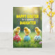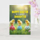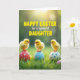 Designed with three fluffy yellow hatchlings as the main focus, this spring scene glows like a gentle morning in a garden. Each little bird has an orange beak and tiny feet, and they lean toward one another with a tender, companionable closeness 🐰. They perch across the lower part of the design on three decorated eggs nestled in thick green grass, arranged side by side for a balanced look. One egg is red with white polka dots, another is light blue with small pink spots, and the third is white with blue circles. Behind them, the background fades into a softly blurred mix of green tones and bright light, keeping attention on the trio. Near the top center, a seasonal greeting sits over the scene in rounded lettering, with yellow and white text that stands out against the hazy backdrop 🌷. The grass blades at the bottom edge are detailed and bright, framing the eggs and the hatchlings’ downy feathers. Share your Easter sentiments with someone special.