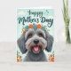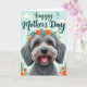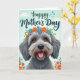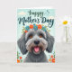 Designed with a centered, shaggy dog that looks straight ahead with wide amber eyes and a friendly open mouth, this card feels like a warm hug ❤️. Its textured fur mixes soft grays and light tans, and a small pink tongue peeks out as if it’s happily greeting someone it adores. A floral wreath sits on its head, filled with orange and bright blue blossoms tucked among fresh green leaves, adding a sweet, affectionate touch. The background is a gentle gradient of sky blue that keeps the scene light and airy, like a quiet morning shared with someone close. Near the top, a flowing line of dark lettering is placed above the dog so it stands out clearly against the pale backdrop. Small matching flowers are scattered around the edges, like little notes of friendship floating in the margins 🌼. A single soft cloud drifts in the upper left, and the wreath’s petals show orange and blue highlights against the cool blue sky.