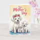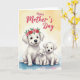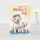 This card shows three fluffy white dogs nestled together, with the larger one on the left looking forward with a gentle, caring expression while the two smaller pups lean close as if sharing a quiet cuddle ❤️. A ring of red and pink flowers rests on the larger dog’s head, adding a sweet, affectionate touch that makes it feel like a family portrait. The pups on the right have wide eyes and small smiles, and their closeness suggests trust and comfort between them. Behind them, the background fades from sunny yellow at the top into soft blue with a faint rosy tint near the bottom, like a calm morning sky. Near the top, the words “Happy Mother’s Day” sit centered above the dogs in flowing magenta lettering, standing out clearly against the light wash. The fur is shown with light texture marks that make the coats look airy and soft, and the gentle spacing between the figures keeps the scene tender rather than busy 🌼. The flower crown is made up of small clustered blossoms in shades of red and pink, placed slightly off-center on the larger dog’s head.