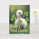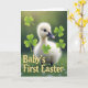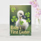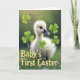 This card features a fluffy white baby waterfowl standing on deep green grass, its downy feathers softly lit from behind for a gentle glow. Small glossy black eyes and a dark bill with a faint pink tip give it a curious, affectionate look, as if it’s leaning in to greet someone close. Tiny white blossoms dot the grass around its feet, adding a fresh spring touch 🌷. Clover-like, three-lobed leaves in bright green are scattered across the scene, with some crisp in the foreground and others fading into a softly blurred green background. The lighting stays diffused and calm, creating a cozy outdoor setting that feels like a quiet shared moment. Along the lower foreground, large yellow lettering reads “Baby’s First Easter,” standing out clearly against the grass. The background shows a bokeh-style wash of green with a few clover shapes softly out of focus 🐇.