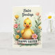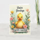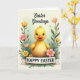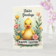 This card features a round, fluffy yellow chick centered in the foreground, with bright blue eyes, a friendly orange beak, and softly rosy cheeks that give it a sweet, companionable look. A loose frame of spring flowers and greenery surrounds the chick, with blossoms in soft pink, peach, sunny yellow, and warm marigold tones, plus leafy stems and small buds tucked between. Near the top, the words “Easter Greetings” appear in a flowing, cursive-style lettering in a dark tone that stands out gently against the light background. Below the chick, a ribbon-like banner stretches across with “Happy Easter” written in a clear, easy-to-read font, set in a darker color for contrast. The background fades from muted cream into a pale mint green wash, creating a calm spring setting that feels like a quiet moment shared between friends 🌷. Tiny heart shapes are scattered lightly in the backdrop, adding a subtle touch of affection without taking attention away from the main figure. The chick’s downy texture is shaded with soft highlights, and the banner shows small stitch-like details along its edges 🐇.
