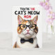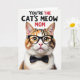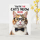 This card shows a close-up portrait of a domestic cat centered on a bright white background, with its head and upper chest filling most of the space. The fur mixes warm brown, orange, and soft white in detailed tabby markings, giving it a cozy, affectionate look that pairs nicely with a little ❤️. Thick black glasses sit on its nose, and a neat black bow tie under the chin makes the cat look like it’s dressed up for someone special. The cat’s golden-yellow eyes catch the light as it looks straight ahead, with a pink nose and long white whiskers adding a gentle, friendly expression 🌼. Across the top, the message “YOU’RE THE CAT’S MEOW MOM” is placed above the portrait in large uppercase letters. Most of the text is black, with a few words in red to add contrast and draw the eye. The lighting stays even and bright, highlighting the fluffy fur texture, the glossy frames, and the crisp bow tie against the white space.
