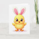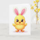 This greeting card features a fluffy yellow chick with tall bunny-like ears lined in soft pink, centered on a bright white background 🐰. Its rounded body fades from sunny yellow into warm orange, giving it a cozy, springtime glow. Large glossy eyes with tiny highlights and fine lashes lean into a sweet, friendly look, as if it’s meeting someone special across the room. A small open beak forms a gentle smile, and a faint rosy blush on its cheeks adds a shy, affectionate touch. Little wings lift slightly outward, like it’s offering a welcoming hug to a close friend 🐇. The greeting text sits near the top in a light pastel pink, with a smaller line beneath it in soft gray. A delicate shadow rests under its orange feet, grounding the character on the white space.