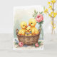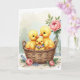 This card shows three fluffy golden-yellow baby birds nestled close together in a rustic woven basket, leaning into one another with the kind of gentle closeness that reads like friendship. Two of them angle their wide-set eyes toward the smallest, as if quietly looking out for it, and their orange beaks sit near its head like a soft nuzzle. The tiniest bird wears a little garland of pastel pink and blue blossoms around its neck, adding a sweet spring detail 🌷. Light falls in a soft, diffused way that brings out the feathery texture and the basket’s woven strands, while the background fades into pale green and cream. In the upper right, a blush-pink peony rests in a clear glass vase, with a deeper red center that draws the eye. Around the basket’s base, a few matching flower sprigs are scattered like little gifts, and the greeting text sits near the top in a gentle pastel tone with a smaller line beneath it in a darker shade 🐰. The scene includes a clear glass vase holding a blush-pink peony with a dark red center in the upper right.