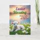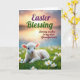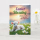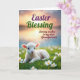 This card shows a fluffy young lamb resting in the lower third of the scene, nestled in rich green grass dotted with tiny white flowers 🌷. Warm, late-day sunlight wraps around its head and ears, creating a soft halo that makes its dark eyes look especially tender and inviting. The lamb’s small smile and relaxed pose suggest a gentle closeness, like a quiet moment shared with someone dear 🐇. Behind it, the background fades into a softly blurred stretch of water that mirrors the sky in oranges and yellows near the horizon, shifting into calmer blues above. Near the top area, the words “Easter Blessing” appear in purple and green, standing out clearly against the glowing sky. Beneath that, a second line reads “Loving wishes to my dear Grandparents” in a flowing, cursive-style font, placed across the upper portion without covering the lamb. The overall layout keeps the detailed grass and wool texture crisp in front while the lake and sky remain dreamy and smooth. Small white blossoms are scattered around the lamb’s body, with a golden reflection shimmering across the water in the distance.