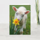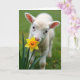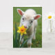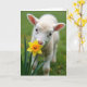 This card features a close-up of a fluffy, pale young lamb with cream-colored fleece, leaning in as if sharing a quiet, friendly moment with a bright spring flower 🌷. Its small pink nose touches the yellow-and-orange petals, like a gentle nuzzle that feels tender and affectionate. Wide, dark eyes look straight outward, giving the scene an inviting, companionable closeness. The background fades into soft green blur, making the lamb and bloom stand out like two little partners in the foreground. A few distant yellow shapes sit out of focus behind them, hinting at more blossoms scattered across a grassy field. The greeting text sits near the top in a soft pastel tone, with smaller matching words placed near the bottom for balance 🐇. Light falls softly across the fleece, showing fine texture along the cheeks and ears, while the flower’s petals shift from golden yellow to warm orange at the tips. The green backdrop stays smooth and muted, with the sharpest detail held on the lamb’s nose and the flower’s center.