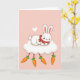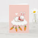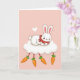 This card features a fluffy white bunny perched calmly on a rounded, cartoon-style cloud 🐰. The bunny has big, shining eyes and a tiny blush on its cheeks, with a red bow tied at its neck that feels like a sweet gift from a close friend. A small white heart floats just above its head, hinting at a tender bond without needing any extra words. The background is a soft pastel pink wash, keeping the scene gentle and cozy. Beneath the cloud, four long orange carrots hang down like dangling treats, each held by a thin red ribbon that matches the bow. There’s no printed message shown, leaving open space around the top and lower area where text could be added in a simple red or white style. Smooth shading and soft lighting keep everything airy, and the carrots line up neatly under the cloud like little lanterns 🌷.
