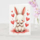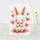 Designed with a fluffy white young rabbit centered on the front, this illustration keeps the focus on its round face, long pale ears with a soft pink blush, and tiny paws held together as if savoring a sweet moment 🐰. Its eyes are closed with fine lashes, rosy cheeks, and a small curved smile that suggests a quiet, affectionate bond, like it’s holding a warm thought close. Creamy whites and gentle shading give the fur a plush look, while a light crimson wash spreads beneath to anchor the scene. Red hearts in several sizes float around the rabbit, adding a romantic, friendly atmosphere without crowding the space 🐇. The overall background stays light and airy, letting the white figure and red accents stand out clearly. A short Easter greeting sits near the top in soft red lettering, with a smaller line beneath in a lighter pink tone. Around the rabbit, the hearts drift upward over the pale backdrop, with the deepest red gathered closest to the center.