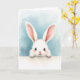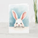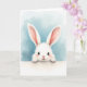Designed with a fluffy white bunny peeking over a bright white horizontal edge, this card draws you in with its long ears and soft, feathery fur 🐰. The bunny’s large dark eyes have a gentle shine, as if it’s looking up at someone it trusts, and faint pink blush warms its cheeks. A tiny rosy nose and small paws resting on the ledge add a tender, almost shy “hello” moment that feels like quiet friendship. Behind the bunny, a muted blue watercolor-style wash spreads across the background, keeping the scene calm and airy. The main greeting text sits centered on the white band below the bunny, set in a light gray tone that stays soft against the page. Smaller supporting text appears beneath it in a slightly darker gray, leaving plenty of open space around the illustration 🌷. The blue backdrop fades lighter toward the center, while the bunny’s ears and paws overlap the crisp white edge in the foreground.