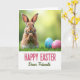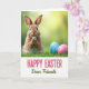 This card shows a fluffy brown bunny standing upright with tall, alert ears and front paws held together, giving it a sweet, affectionate look 🐰. Its dark, shiny eyes seem to linger as if it’s quietly sharing a friendly moment with the viewer. Beneath it, bright green grass fills the foreground, creating a fresh spring setting. Nearby sit two decorated eggs, one in sky blue with red and yellow dots and the other in pink with scattered blue, white, and gold specks 🌷. The background fades softly into warm greens and gentle yellows, like sunlight filtering through an outdoor garden. Along the bottom, a white panel runs across the design with the main greeting centered in rose-pink lettering. Just below, a smaller line of text appears in deep forest green, aligned neatly and reading like a note meant for friends. The bunny and eggs sit just above the white panel, with the eggs angled slightly toward the bunny on the grass.