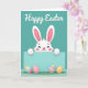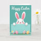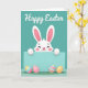 Designed with a cheerful spring scene, this card features a fluffy white bunny peeking over a wide teal strip, as if leaning in for a friendly hello 🐰. Its eyes are closed in a big smile, with rosy cheeks and tall ears lined in pink that give it a sweet, affectionate look. Two small rounded paws rest on the top edge of the teal strip, adding a cozy, “I’m right here with you” closeness. Beneath the bunny, four decorated egg shapes sit on a low patch of soft green grass, arranged like little gifts waiting to be found 🌷. The eggs show mixed patterns—stripes and chunky shapes—in sunny yellow, soft pink, calm blue, and bright orange, creating a lively contrast against the teal background. At the top, a short greeting appears in white lettering, centered and spaced clearly so it stands out against the solid teal. Gentle shading along the bunny’s face and the eggs adds rounded depth without heavy shadows. The teal strip runs horizontally across the middle, with the bunny’s paws hooked over its upper edge and the patterned eggs lined up below on the grassy base.