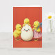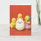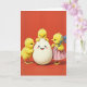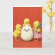 This design shows three fluffy yellow baby birds gathered around a large white egg with a friendly face, set against a solid deep red background 🌷. The egg’s wide smile, rosy cheeks, and dark sparkling eyes make it feel like a gentle friend in the middle of their little circle. One bird peeks down from above with its tiny beak close to the top of the egg, as if sharing a curious hello. On the left, another bird leans in with a soft, attentive posture that reads like close companionship. On the right, the third bird wears a red-and-white checkered dress and holds a small bunch of bright blue flowers 🐇. The strong contrast of blue petals against the warm yellows and reds adds a sweet, affectionate note, like a small gift being offered. Any greeting text would sit neatly near the top in light-colored lettering that stands out clearly on the red field, while the egg’s rosy cheeks glow gently near the center. The lighting stays even and bright, and the blue flowers show small clustered petals beside the dress’s check pattern.