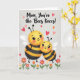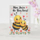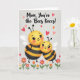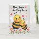 Designed with a sweet digital illustration, this card shows two fuzzy, human-like insects with black-and-yellow striped bodies, one larger and one smaller, cuddled close as if sharing a quiet “I’m here with you” moment ❤️. Their round faces have a soft blush on the cheeks, and their shiny dark eyes meet with a tender, friendly gaze. Light, see-through wings fan out behind them, adding an airy touch without distracting from the embrace. Near the top, a short message sits centered in a casual, handwritten look, set in a dark tone that stands out clearly. Around the words, small pastel hearts drift across the off-white, lightly textured background like confetti 🌼. Along the bottom edge, a row of simple flowers forms a border, mixing reds, oranges, and creamy shades to frame the scene. The fuzzy texture on their bodies looks softly brushed, giving the hug extra warmth. Pastel hearts float above the pair, while the flower border runs straight across the lower margin.