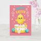 This card shows a fluffy yellow chick standing proudly on a round cake, its wide eyes and rosy cheeks giving it a sweet, friendly look, with tiny wings lifted as if reaching out for a hug 🐰. The cake is trimmed with delicate yellow lace-like piping and small red accents, making the chick look like the guest of honor at a spring party. Around the cake’s base, several decorated eggs rest in a loose circle, mixing polka dots, wavy stripes, and little stars and triangles in shades of blue, orange, and teal 🐇. The background is a soft pastel pink, sprinkled with small white flowers and curling vine-like swirls that add a gentle, affectionate mood to the scene. Near the top, a festive greeting is set in big rounded letters, with teal characters outlined or paired with bright yellow for contrast. The text sits centered above the chick and cake, leaving open space around it so the message feels airy and easy to read. The overall layout keeps the chick and cake in the middle while the eggs and white floral details frame them like friendly companions. A few white flower shapes and thin swirling curls float across the pink backdrop behind the teal-and-yellow headline.