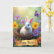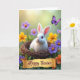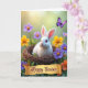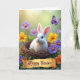 This greeting card shows a fluffy white bunny with long upright ears and bright red eyes, curled comfortably in a twig nest as if settling in close to someone dear 🐰. Around it, spring flowers fill the scene in soft lavender, sunny yellow, and warm orange, with leafy greens framing the bunny like a gentle hug. The lighting is diffused and tender, giving the fur, twigs, and petals a soft glow that feels quietly romantic and calm. Near the upper background, a small purple winged insect hovers, adding a light touch of motion to the garden setting 🌷. The background fades into a pastel blur, keeping attention on the bunny’s calm gaze and the cozy nest texture. Along the bottom, a gold scroll-style banner stretches across the design with “Happy Easter” centered in flowing lettering. The text appears in a darker tone against the gold banner, making it easy to read without overpowering the illustration. The banner’s curled ends and warm metallic shading stand out against the green foliage and scattered blossoms.