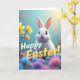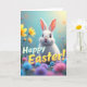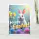 Designed with a fluffy white bunny at the center, this card shows it peeking up from a bed of spring wildflowers 🐰. Its bright eyes meet yours with a tender, friendly look, and the pink inner ears and tiny nose add a sweet, gentle charm. The foreground is filled with small blossoms in yellows, pinks, blues, and purples, softly blurred in places so the bunny stays the main focus. Behind the flowers, the sky shifts from cool turquoise on the left to a warm golden glow on the right, like late sunlight touching the scene. Near the bottom, the words “Happy Easter!” sit prominently across the lower area in sunny yellow letters outlined in light blue. The rounded lettering looks slightly raised against the floral field, giving the greeting extra presence without crowding the artwork 🌷. Fine whiskers and soft shading in the fur add texture, while the background flowers fade gently into the distance with a light, dreamy haze. A pale turquoise sky blends into a golden patch of light at the upper right above the purple and yellow blooms.