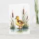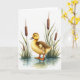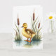Designed with a fluffy young water bird as the main focus, this card places the little creature front and center on a bright white background. Its soft down blends sunlit yellow with warm brown, giving it a gentle, cozy look that feels like a quiet hello between friends 🌷. Small black eyes glance slightly to the left, as if watching someone nearby with calm curiosity. The bird stands on orange webbed feet, partly in shallow water shaded in cool blues and greens, where light ripples mirror its shape. Tall marsh plants rise around it, with slim green stalks topped by rounded brown seed heads that add a calm, natural frame. There is no headline text across the top, keeping the scene open and airy, and any message area is left as clear white space below for a note. A tiny bunny accent 🐇 sits near the lower margin in a light gray tone. The water’s surface shows soft, layered reflections beneath the orange feet and the nearby reeds.