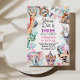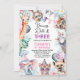 Colorful safari themed young, wild and three birthday invitation for girl featuring various jungle animals, bunting flag, balloons, party hats and foliage. All text is editable making the template suitable for any age.