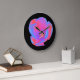 This awesome clock features a beautiful photograph of a tulip. The photograph has been artificially coloured resulting in a fluorescent tulip. The outer petals are coloured with shades of blue and red, while the inner petals show shades of pink and purple. The very centre of the flower is bright yellow. The simple black background shows off the stunning beauty of this flower.