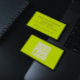 Business card in fluorescent yellow (#DFFF00) solid color background and a cover logo .Personalize both sides now . Modern and trendy design by Alma Wad .It comes 100 in a pack .