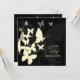 The butterflies, fluttering by, in cream silhouettes on rich black background and faded ornamental leaves embellished with swirls and curls in cream on blue. For fanciful occasion.. wedding, anniversary, open house, invitation for an auction!! For more colors >>