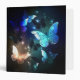 Fabulous, glowing, blue and yellow, night butterfly on dark background.
