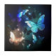 Fabulous, glowing, blue and yellow, night butterfly on dark background.