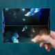 Fabulous, glowing, blue and yellow, night butterfly on dark background.