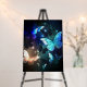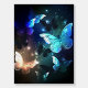 Fabulous, glowing, blue and yellow, night butterfly on dark background.