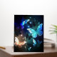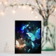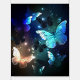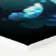 Fabulous, glowing, blue and yellow, night butterfly on dark background.