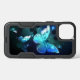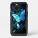Fabulous, glowing, blue and yellow, night butterfly on dark background.