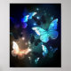 Fabulous, glowing, blue and yellow, night butterfly on dark background.