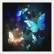 Fabulous, glowing, blue and yellow, night butterfly on dark background.