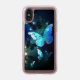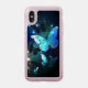 Fabulous, glowing, blue and yellow, night butterfly on dark background.