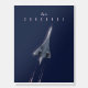 The image showcases a sleek, silver Concorde supersonic jet flying against a deep blue sky. The aircraft is depicted from a bottom-up perspective, highlighting its distinctive delta wings and pointed nose. The jet leaves a trail of white contrails behind it, emphasizing its speed and power.