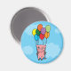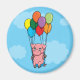 Featuring a digital illustration of pink pig using a bunch of multicoloured balloons to fly high into the cloudy blue sky.