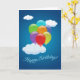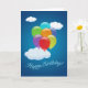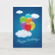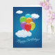 Birthday card with cartoon illustration of flying colorful balloons and fluffy clouds.