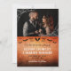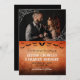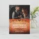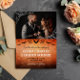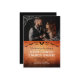 Halloween or goth wedding save the date with a photo of the two of you adorned with printed spider web in the corners, and your save the date wording in a gothic font against a distressed orange background with flying bats. Halloween save the date with your photo, bats, and spider web. Orange and black goth save the date personalized with a photo to inform your guests about your upcoming goth wedding.