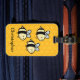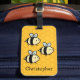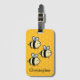 Three happy black and yellow bees on a yellow and orange honeycomb background. A template below to add your name to personalize.