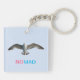 Flying seagull bird and bicolor calligraphy on light blue Keychain.
