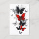 Flock of flying, realistic, red and black morpho butterflies on white background with drops of paint.