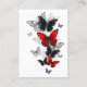 Flock of flying, realistic, red and black morpho butterflies on white background with drops of paint.