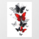 Flock of flying, realistic, red and black morpho butterflies on white background with drops of paint.
