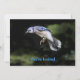 Photo of a flying blue jay with a background of green leaves and ferns and dark shadows. The comical bluejay is seen in mid-flight, with his bright blue feathers showing up nicely against the trees in the background.