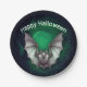 This paper plate has a creepy flying grey with green tint bat with wings spread out of a misty glowing green cave. Customise the Happy Halloween text with the template.